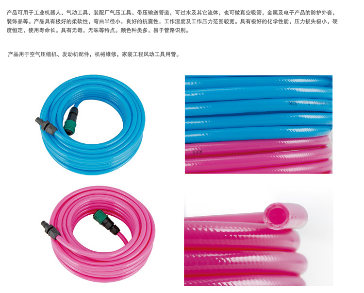 產(chǎn)品可用于工業(yè)機器人、氣動(dòng)工具、裝配廠(chǎng)氣壓工具、帶壓輸送管道,可過(guò)水及其它流體,也可做真空吸管,金困及電子產(chǎn)品的防護外套,裝飾品等。產(chǎn)品具有極好的柔軟性,彎曲半徑小,良好的抗震性,工作濕度及工作壓力范圍較寬。具有極好的化學(xué)性能,壓力損失極小,硬度恒定,使用壽命長(cháng)。具有無(wú)毒,無(wú)味等特點(diǎn)。顏色種類(lèi)多,易于管路識別。